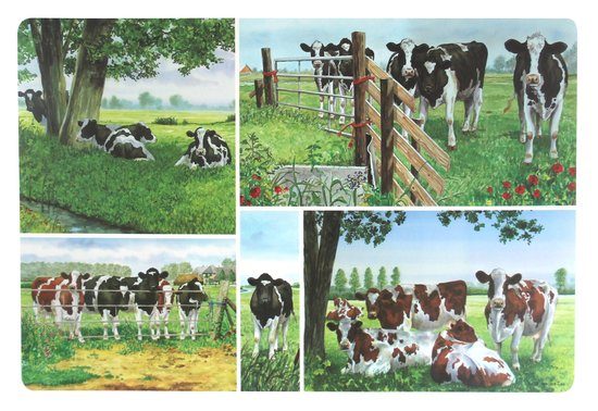 Deze originele placemat is voorzien van 5 verschillende decoren met koeien, uit de serie van Wiebe van der Zee landleven.