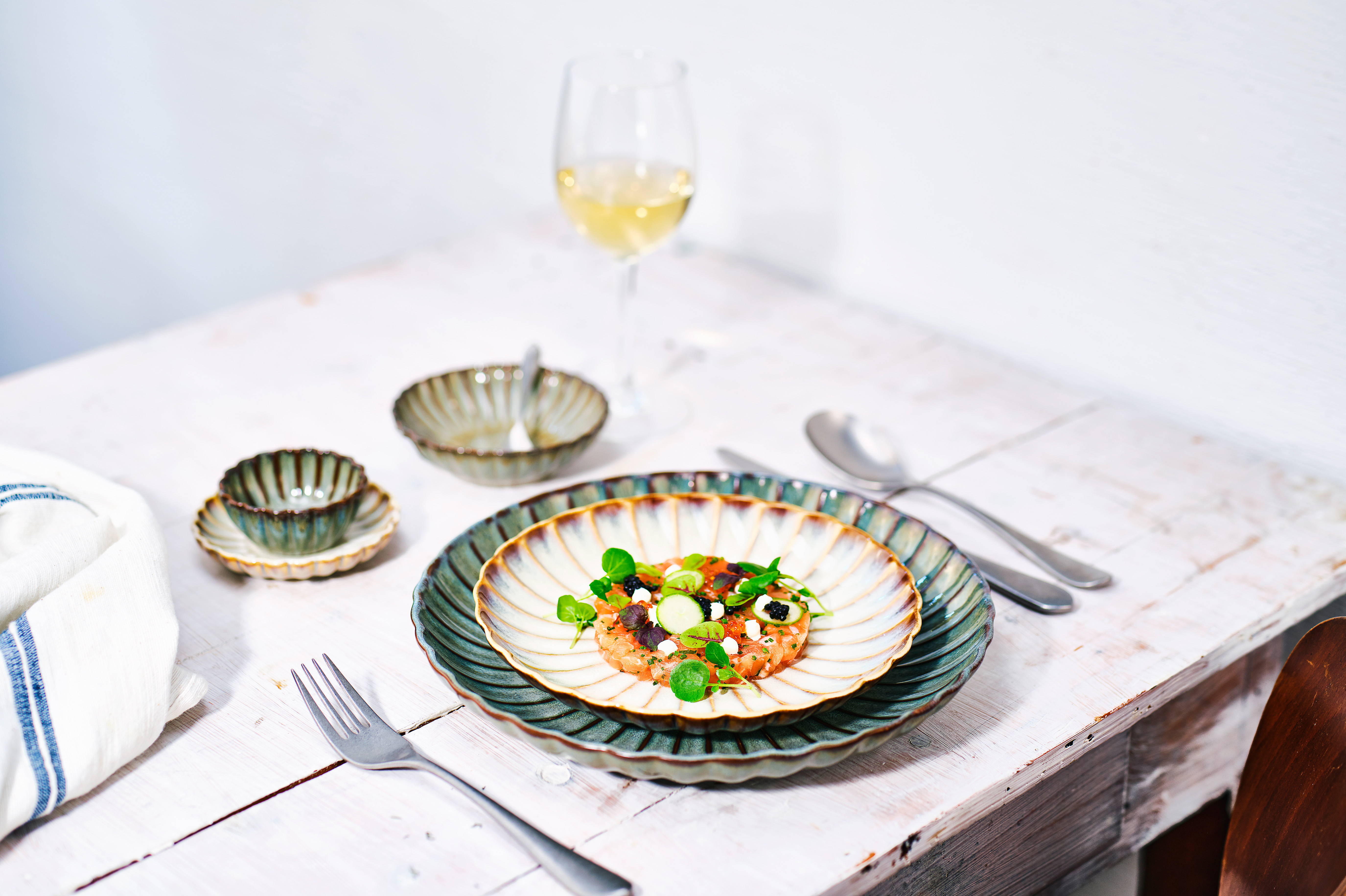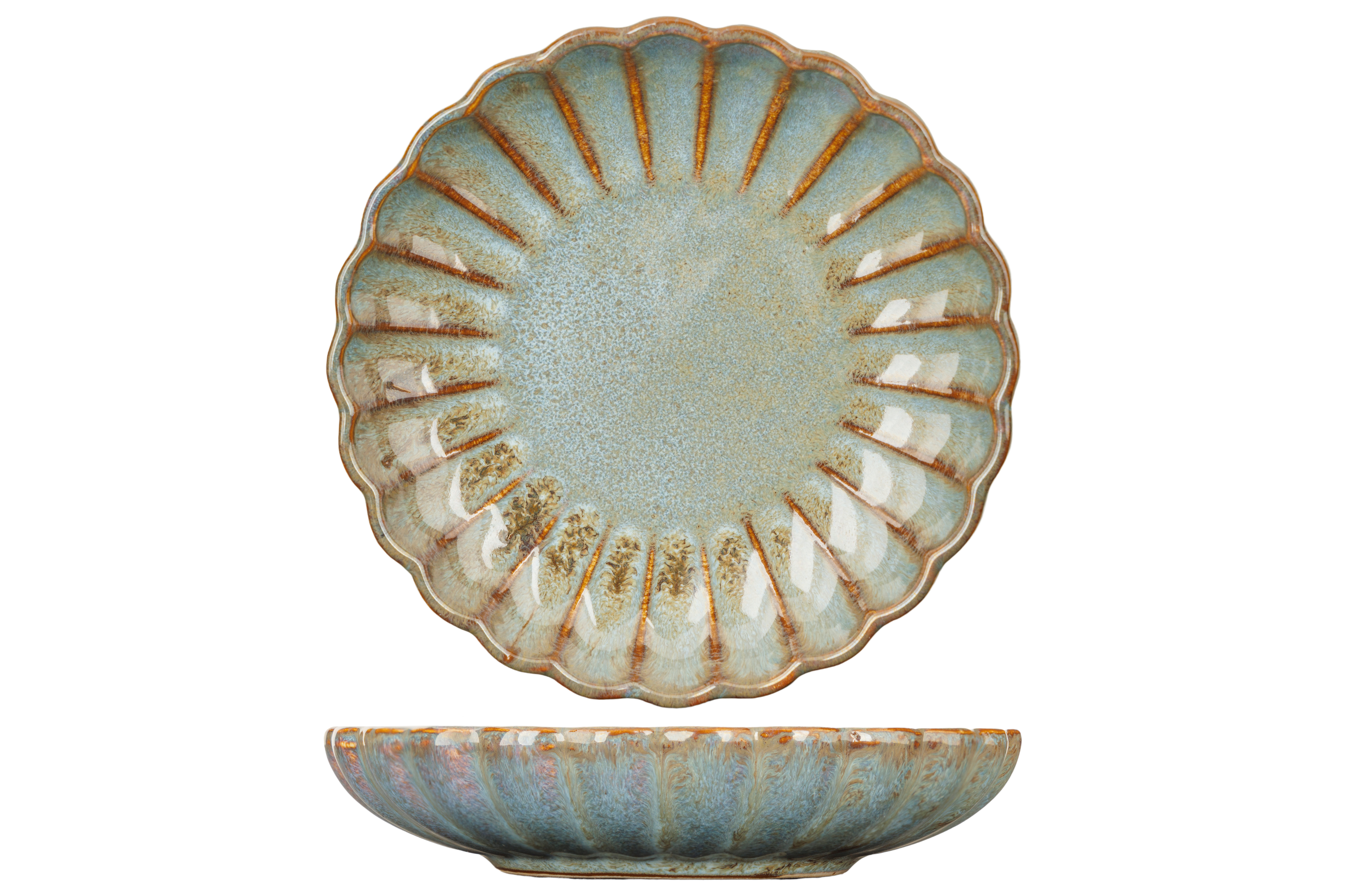 Het aardewerk uit de Astera reeks roept herinneringen op aan een traditioneel Japans servies met chrysantmotieven. De prachtig uitgevoerde bloembladen zijn zichtbaar en voelbaar. De bloembladen waaieren uit en vormen zachte geultjes die overgaan in een platte bordspiegel. Door de reacties van het glazuur in de oven verwent deze reeks uw gasten met spectaculaire kleurvariaties die altijd de aandacht trekken. Brede keuze aan borden, schalen en kommen, beschikbaar in Pure, Pearl en Ocean.