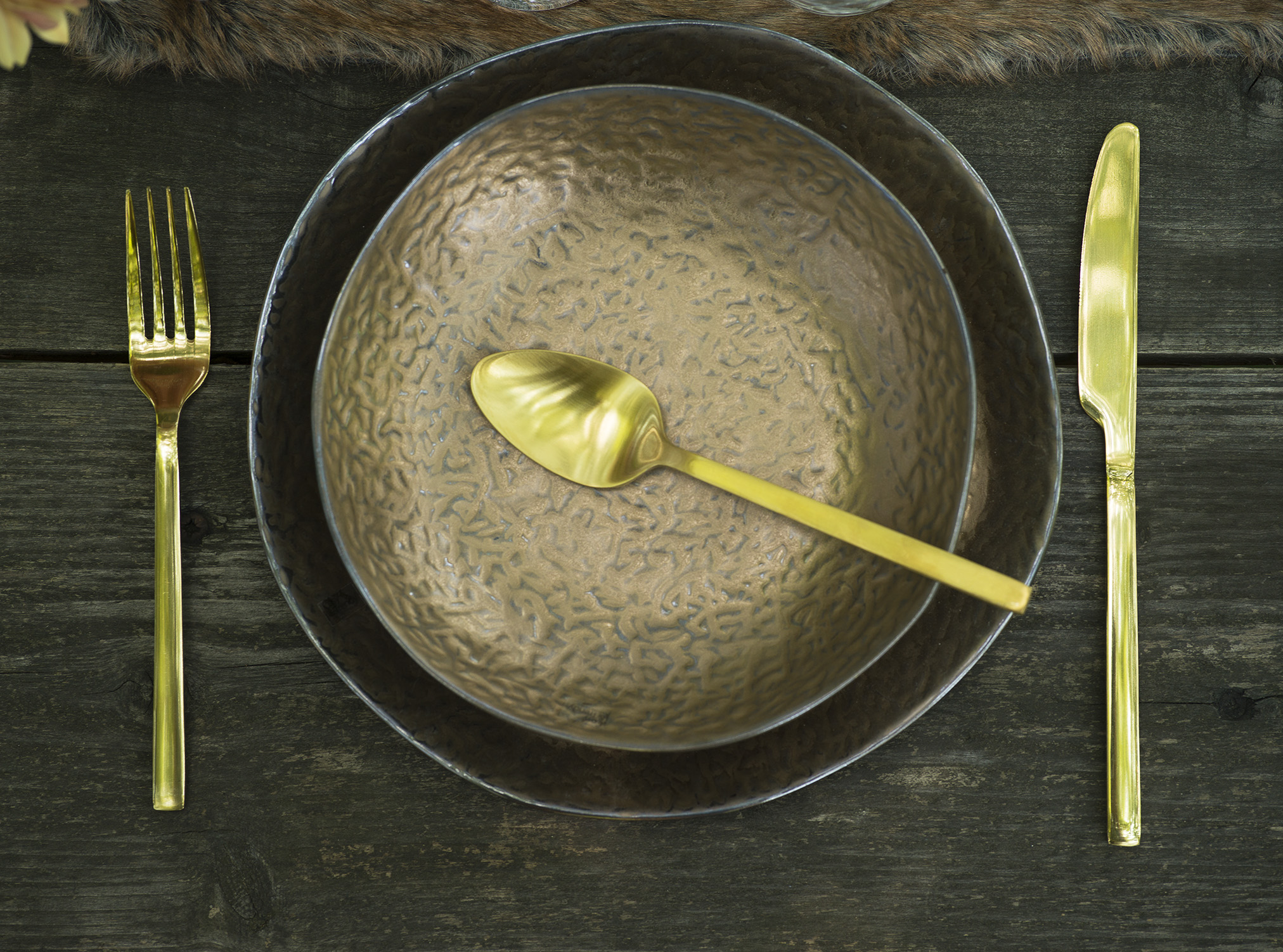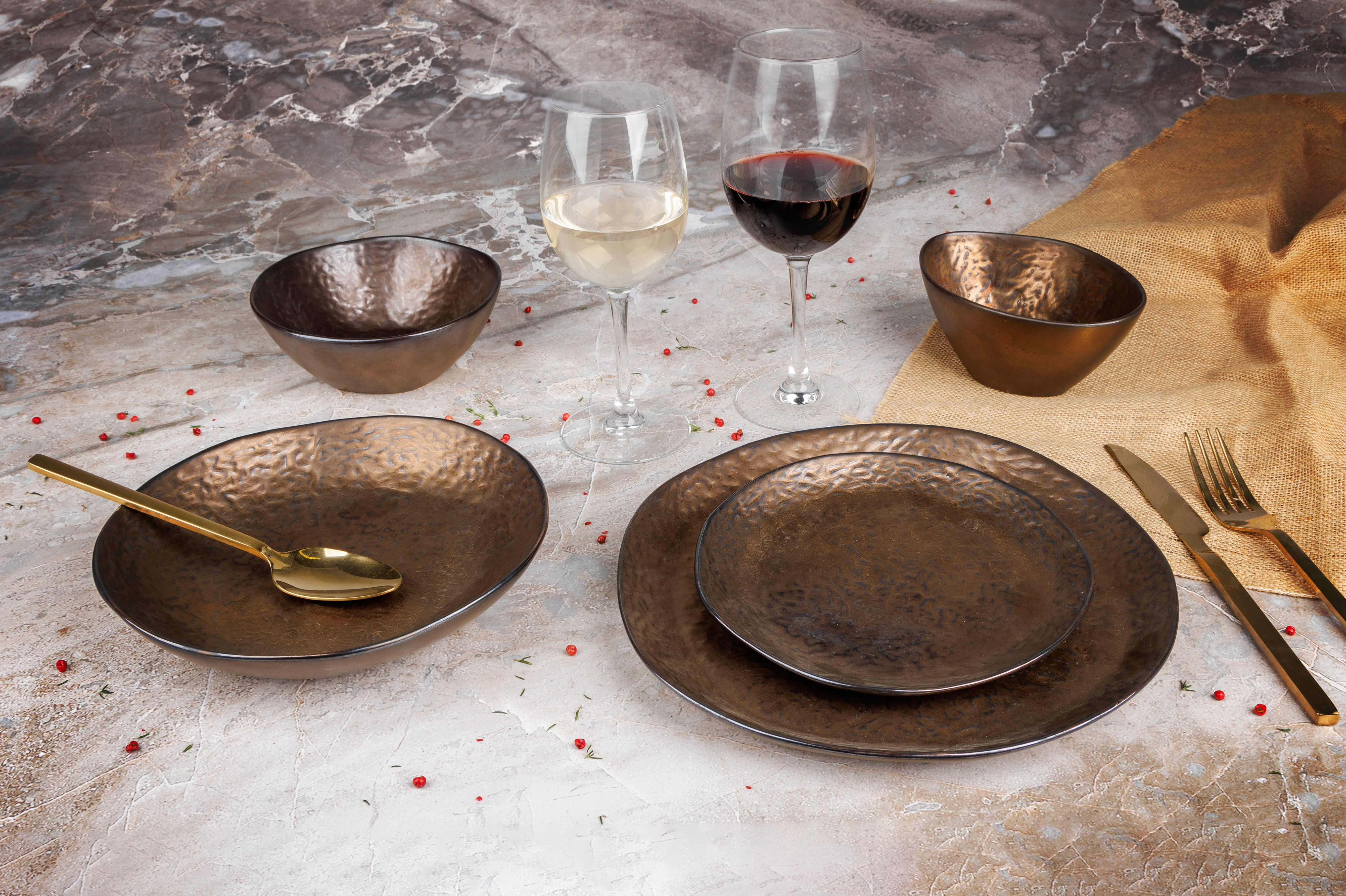 Keer terug naar de kopertijd met deze unieke bordenreeks van Cosy & Trendy. De reeks uit aardewerk heeft een realistische koperlook en -feel. De borden in drie verschillende formaten hebben allemaal een grillige vorm en een ruw reliëf, net als ambachtelijk servies uit handgeslagen koper.