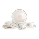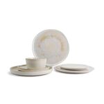 Fleur je tafel op met "Glister". Deze elegante collectie is een sprankelende eye-catcher op de feesttafel. Alle producten bevatten kleine glinsterende gouden kristallen, waardoor de collectie een luxueuze uitstraling krijgt. Borden met opstaande rand en ongelijke, vrij gevormde randen, wat meer een handgemaakte look geeft. Alle producten zijn zorgvuldig vervaardigd in Europa.