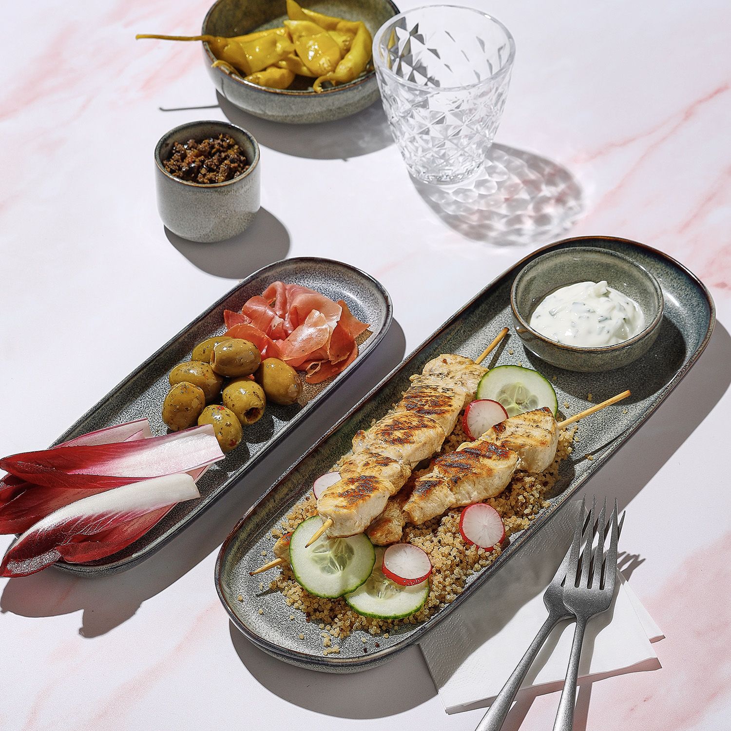 Serveer in stijl met de 29x10xH2cm groen/blauwe serveerschaal uit de Meridian-collectie. De reactieve glazuur en unieke gespikkelde design maken elke maaltijd tot een meesterwerk. Perfect om je culinaire creaties thuis te presenteren, deze schaal is een must-have voor elke tafelsetting.