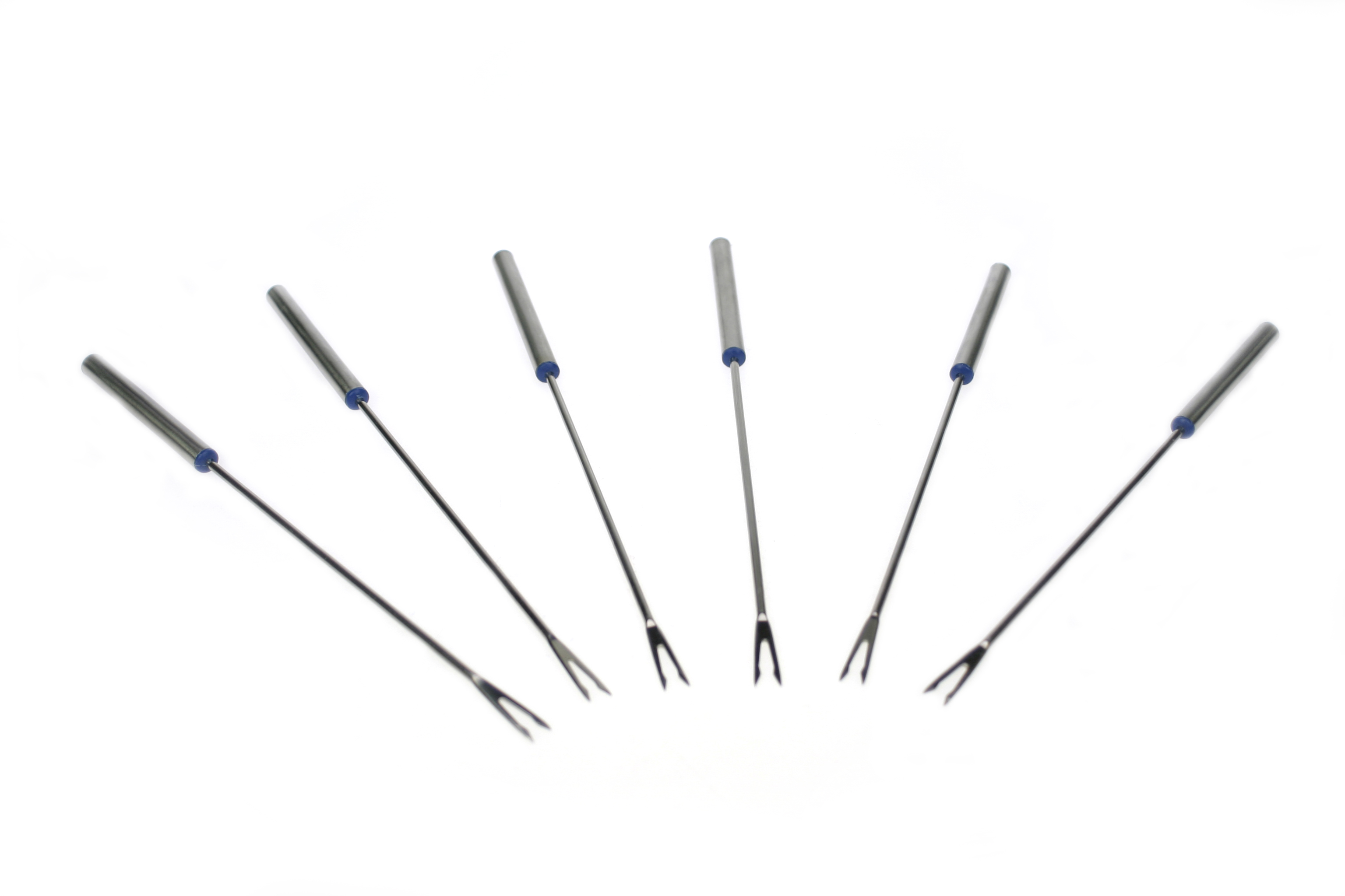 Deze fonduevorken in roestvrij staal zijn extra lang, smal, spits en scherp. Ze dienen om blokjes vlees en vis op te prikken en onder te dompelen in de hete olie. Maar ook schaaldieren, fruit en gepaneerde kaasballetjes zijn heerlijk in een fondue. Zitten rond de fonduepot, kijken naar pruttelende hapjes en wachten tot uw menu gaar wordt, wat kan een avond gezellig zijn. De fonduevorken laten u zeker niet in de steek: de uiteinden zijn zo scherp dat de stukjes goed op de vorken blijven vastzitten. Tast toe!